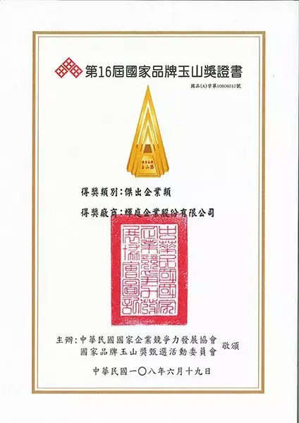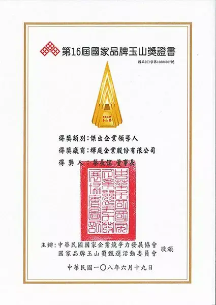 รางวัล National Brand Yushan Award คัดเลือกโมเดลองค์กรที่มีการแข่งขันสูงที่สุด เพื่อส่งเสริมให้บริษัทในไต้หวันทำงานหนักและมุ่งมั่นที่จะสร้างภาพลักษณ์ของแบรนด์ระดับชาติ เนื่องจากการจัดการแบบท้องถิ่นด้วยการออกแบบผลิตภัณฑ์ที่มีคุณภาพและการจัดตั้งกระบวนการอัตโนมัติเต็มรูปแบบและการจัดการมานานกว่า 30 ปี กลุ่ม Huei Tyng จึงได้รับรางวัลสองรางวัล "รางวัลผู้นำธุรกิจดีเด่น" และ "รางวัลองค์กรดีเด่น"